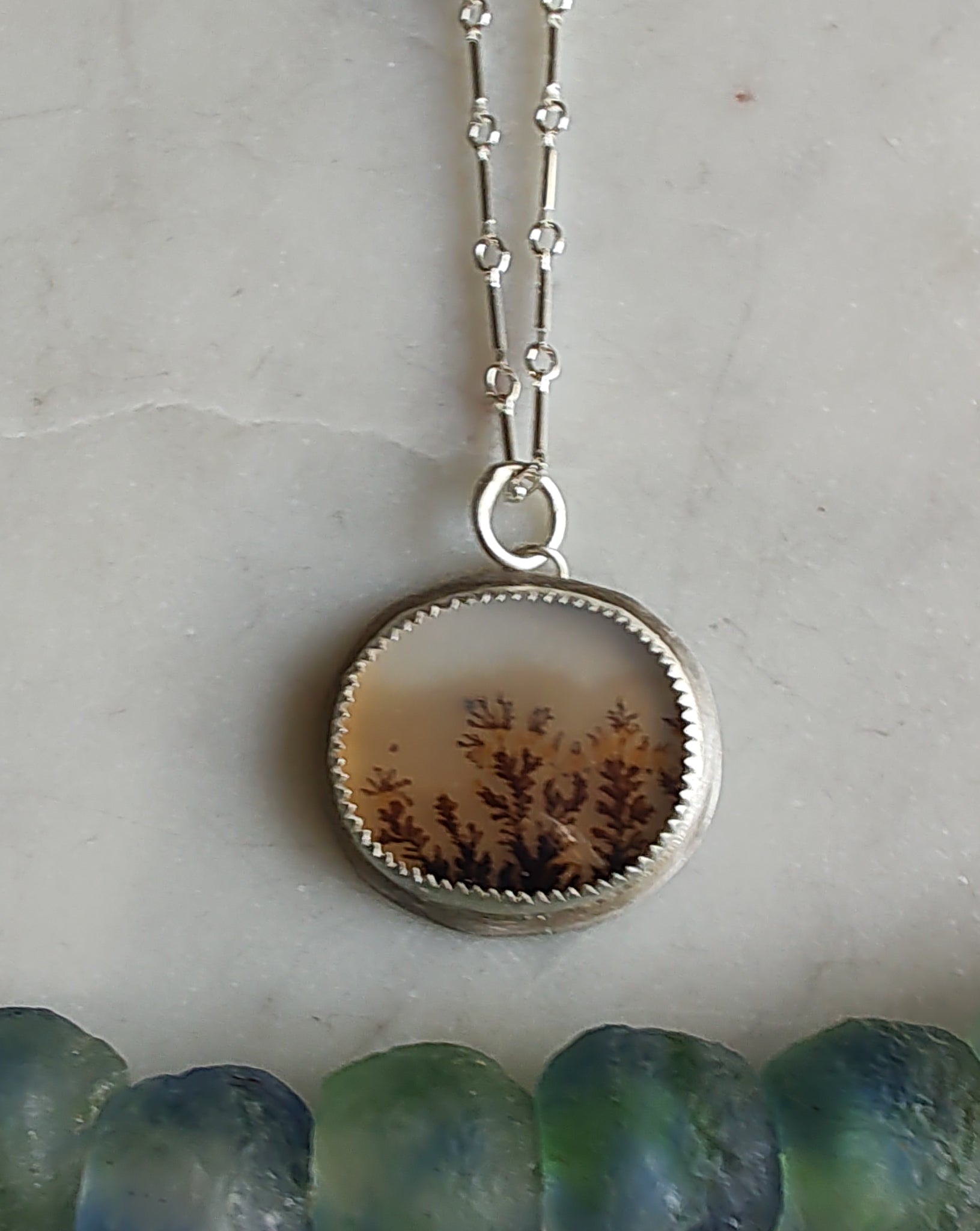 This dendritic quartz is a one-of-a kind stone. This piece looks like a fall scene with trees and a setting sky.