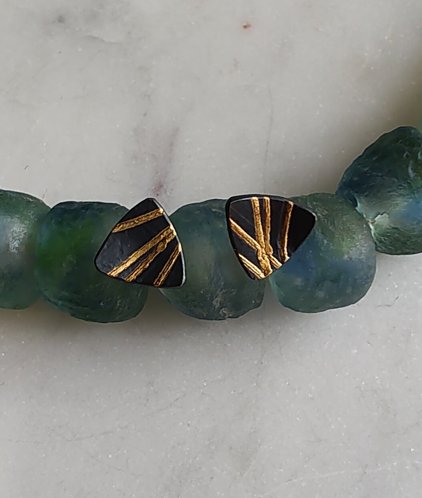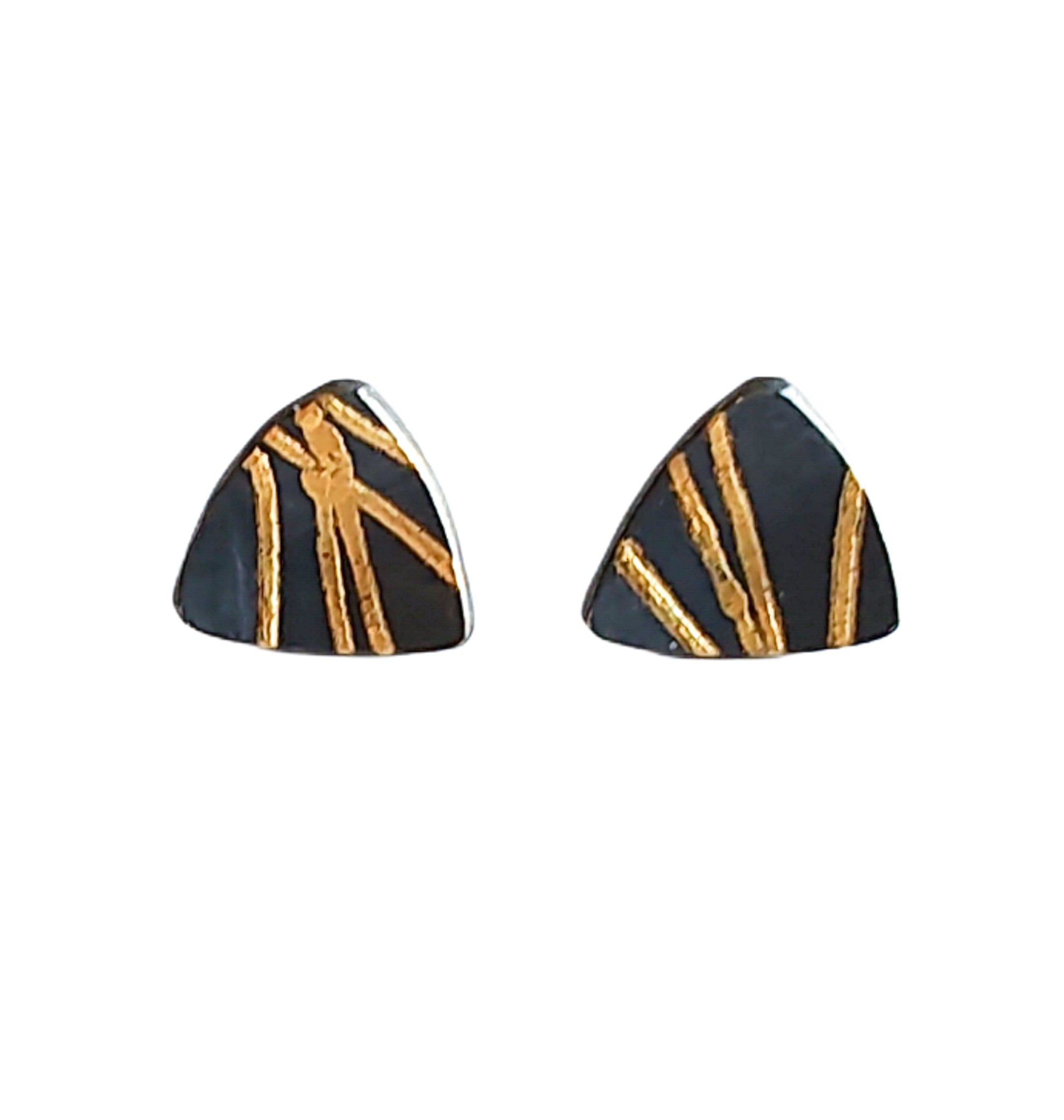 Fun triangle-shaped stud earrings with ribbons of 24 k gold.