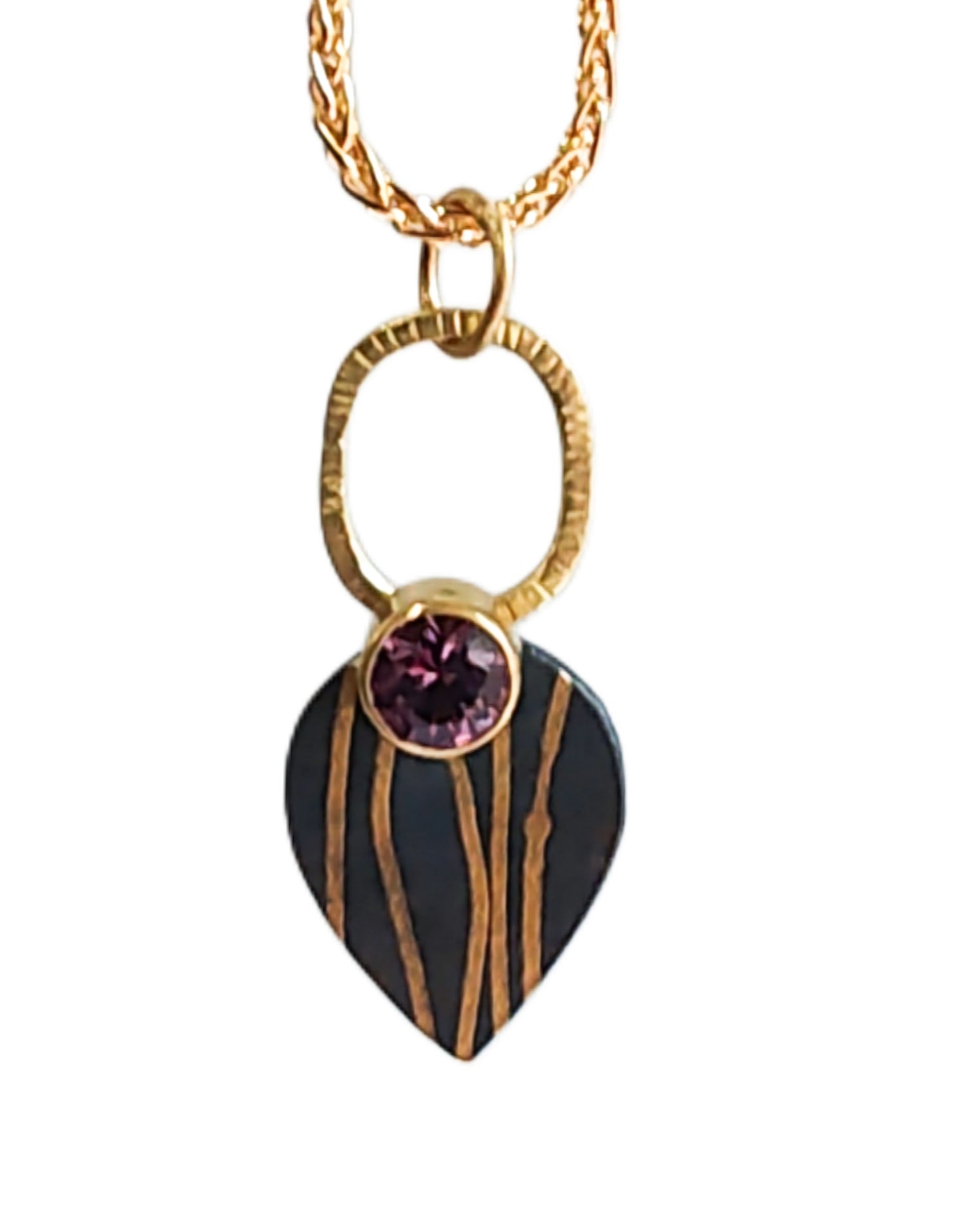 A 5.5 mm stunning pink spinel looks divine against a backdrop of 24 karat gold ribbons on oxidized silver. 18 karat gold bezel and bail.