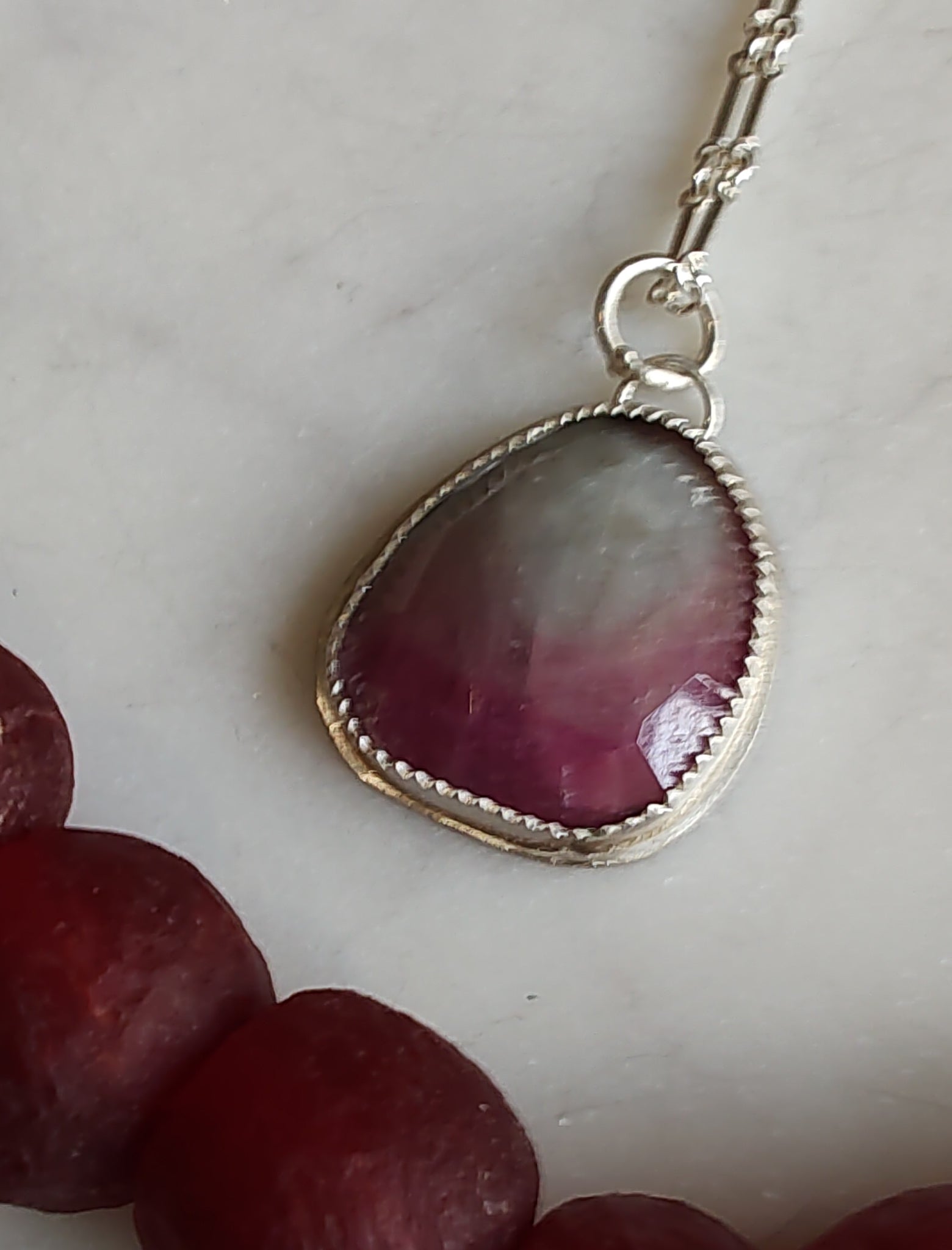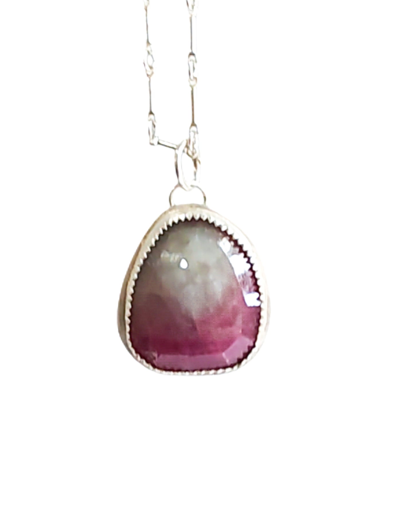 This rosecut pink sapphire has a pretty ombre effect, going from a milky quartz color to a raspberry color.