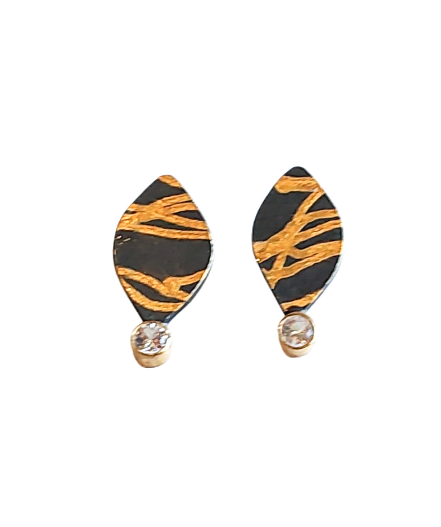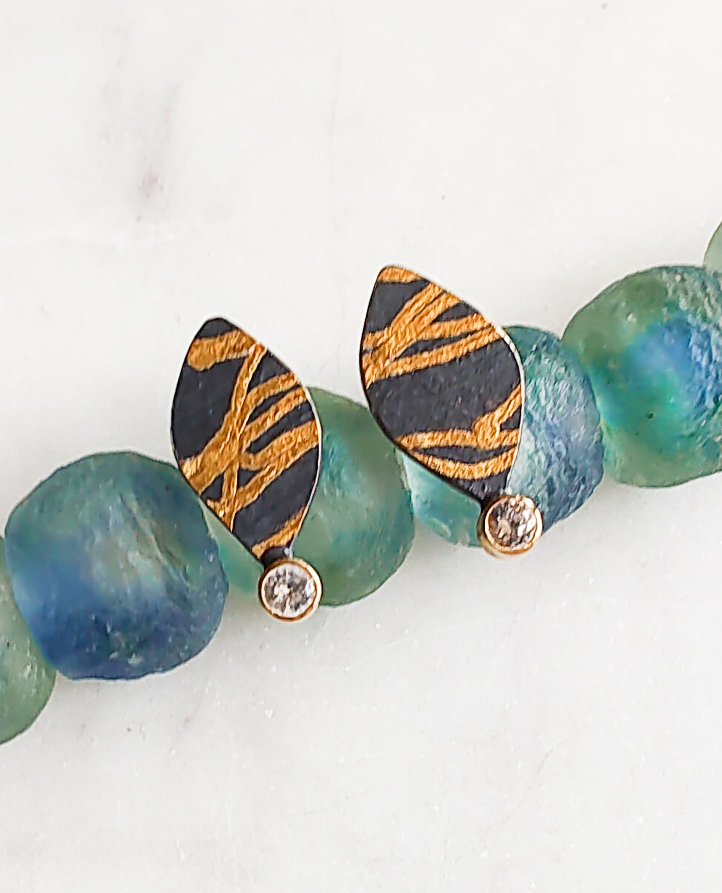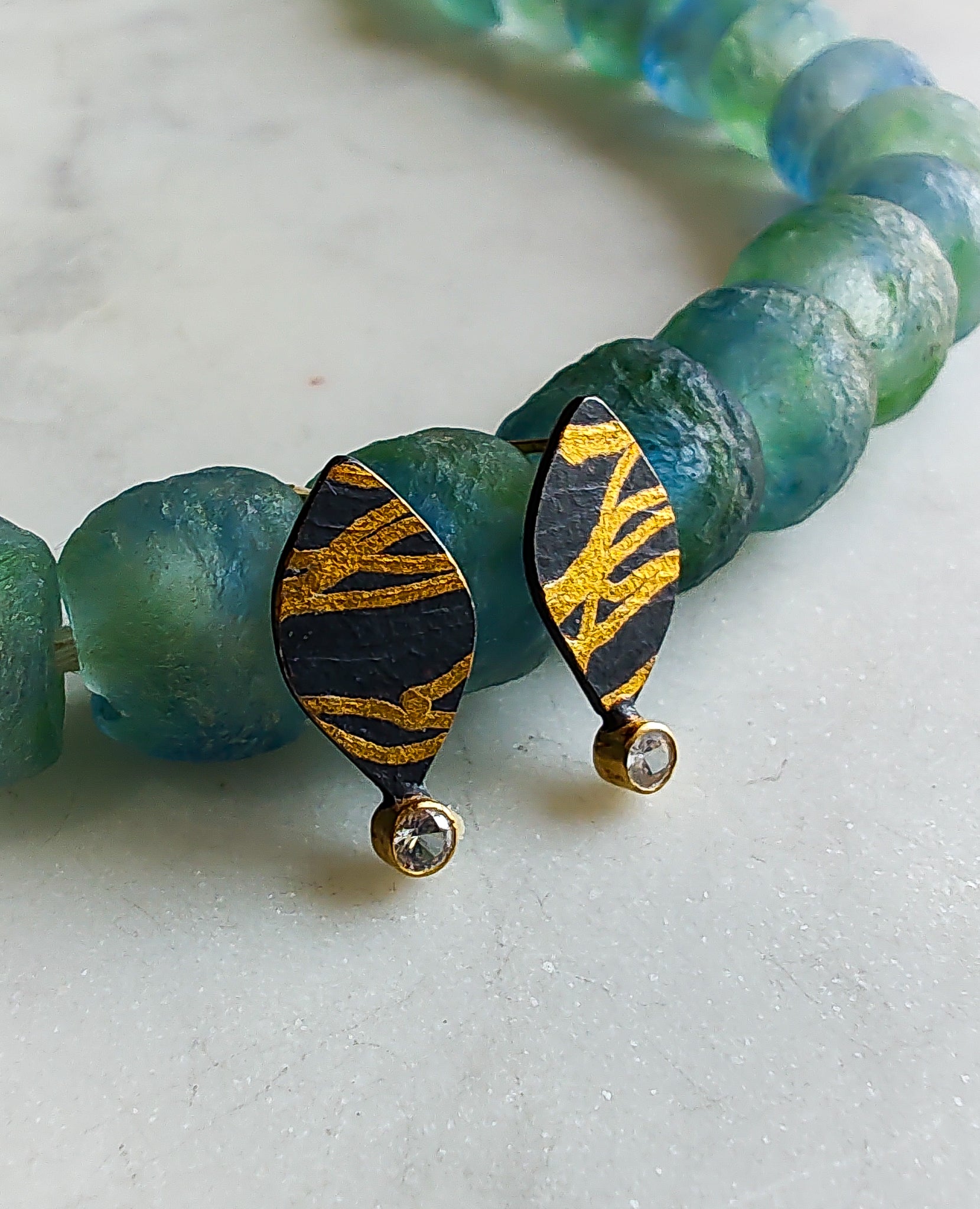 Deep black oxidized sterling silver sets off 24 k gold ribbons highlighted with white sapphires set in 18 k gold.